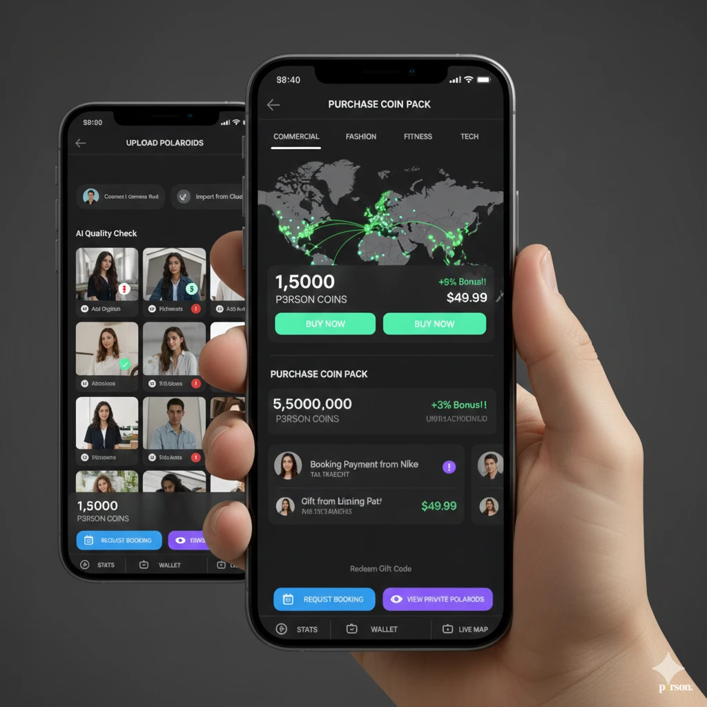 You keep 90% of every booking. Your talent score (P3RSON Index) powers AI matching. Payments are GPS-verified and processed same-day via Smart Escrow. No office. No gatekeepers. No 20% cut.